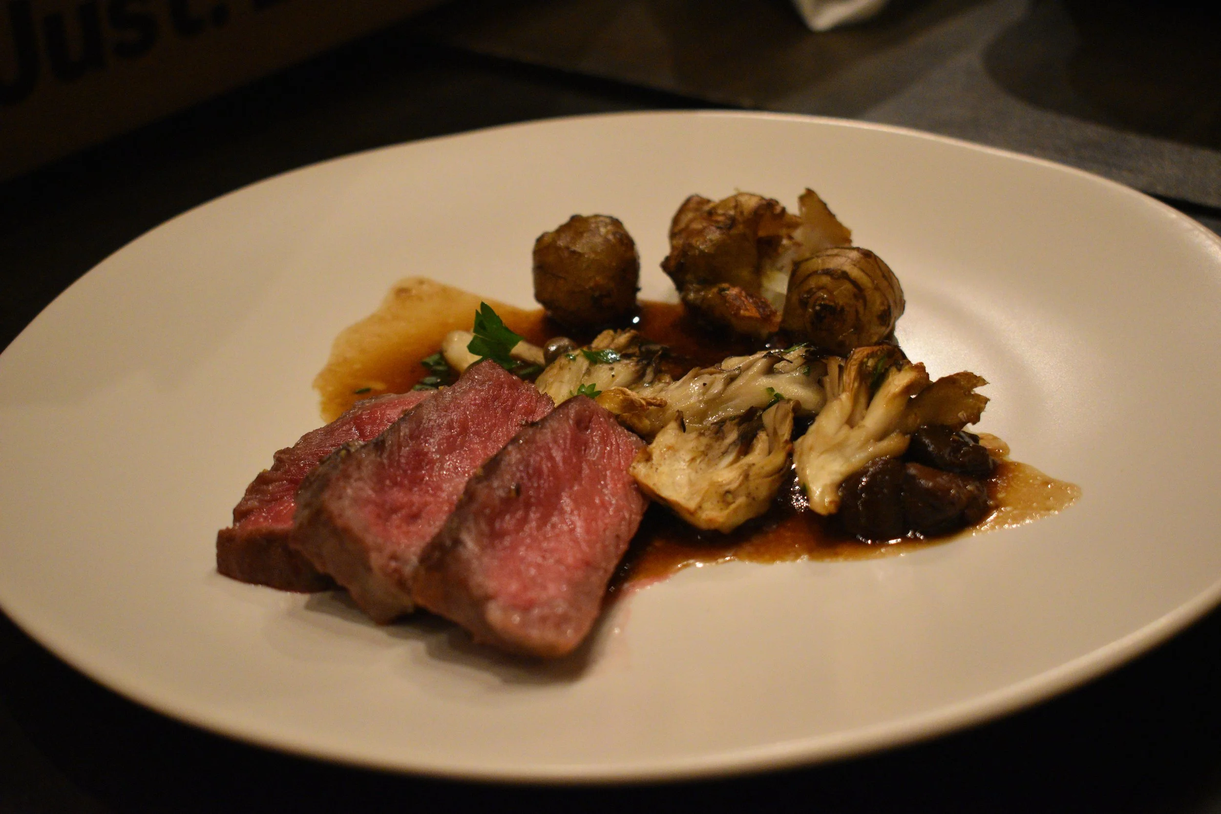 4th Course: 3 Month Dry Aged Ribeye with a black garlic and bone marrow demiglace, roasted Maitake mushrooms, and roasted sunchokes with brown butter.