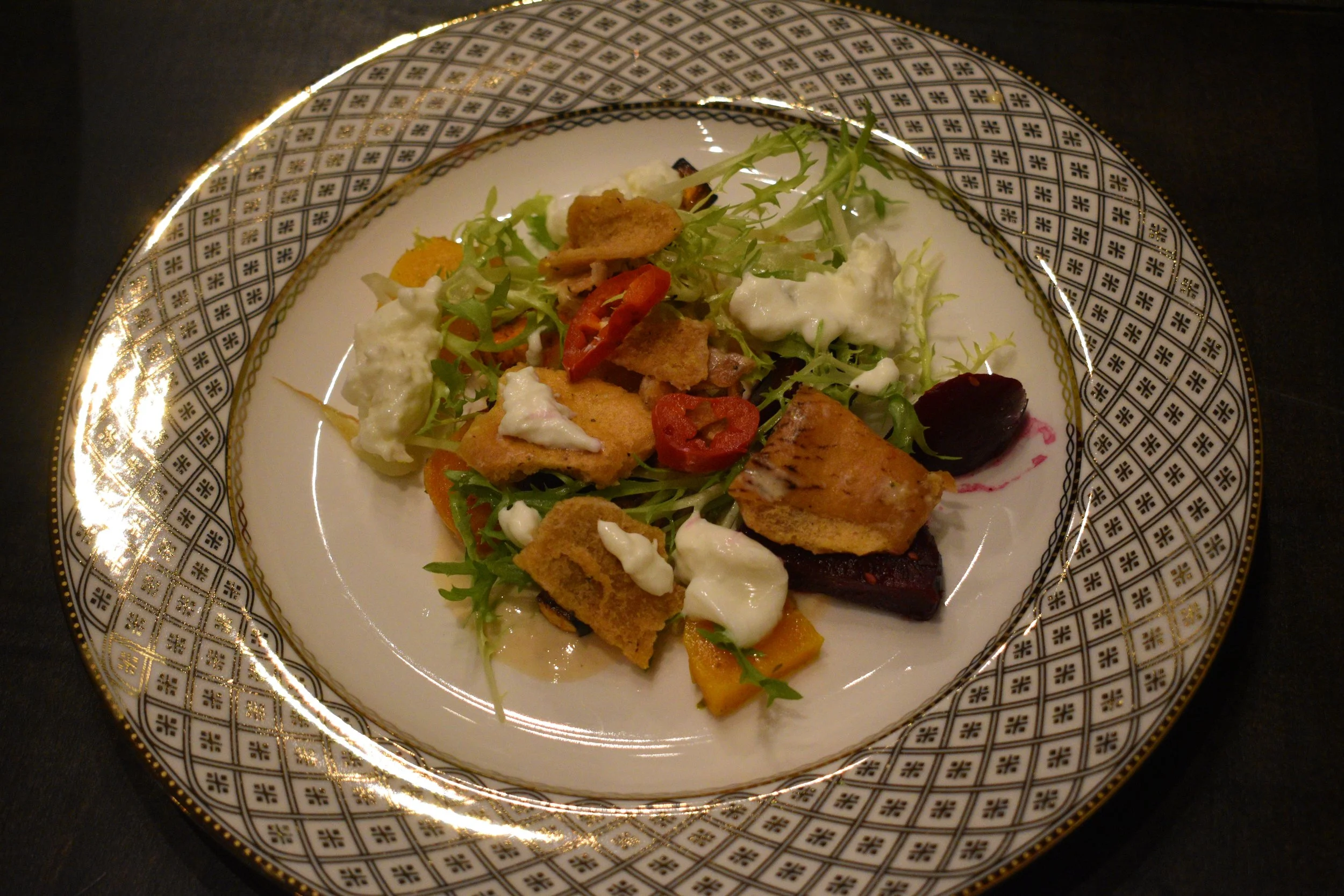 1st Course: Winter “Panzanella” Salad: Toasted Pita Chips tossed in lemon and black pepper, a tahini vinaigrette, roasted beets tossed in zatar, roasted sweet potato tossed in sumac, torn burrata, and pickled fresno chilis.