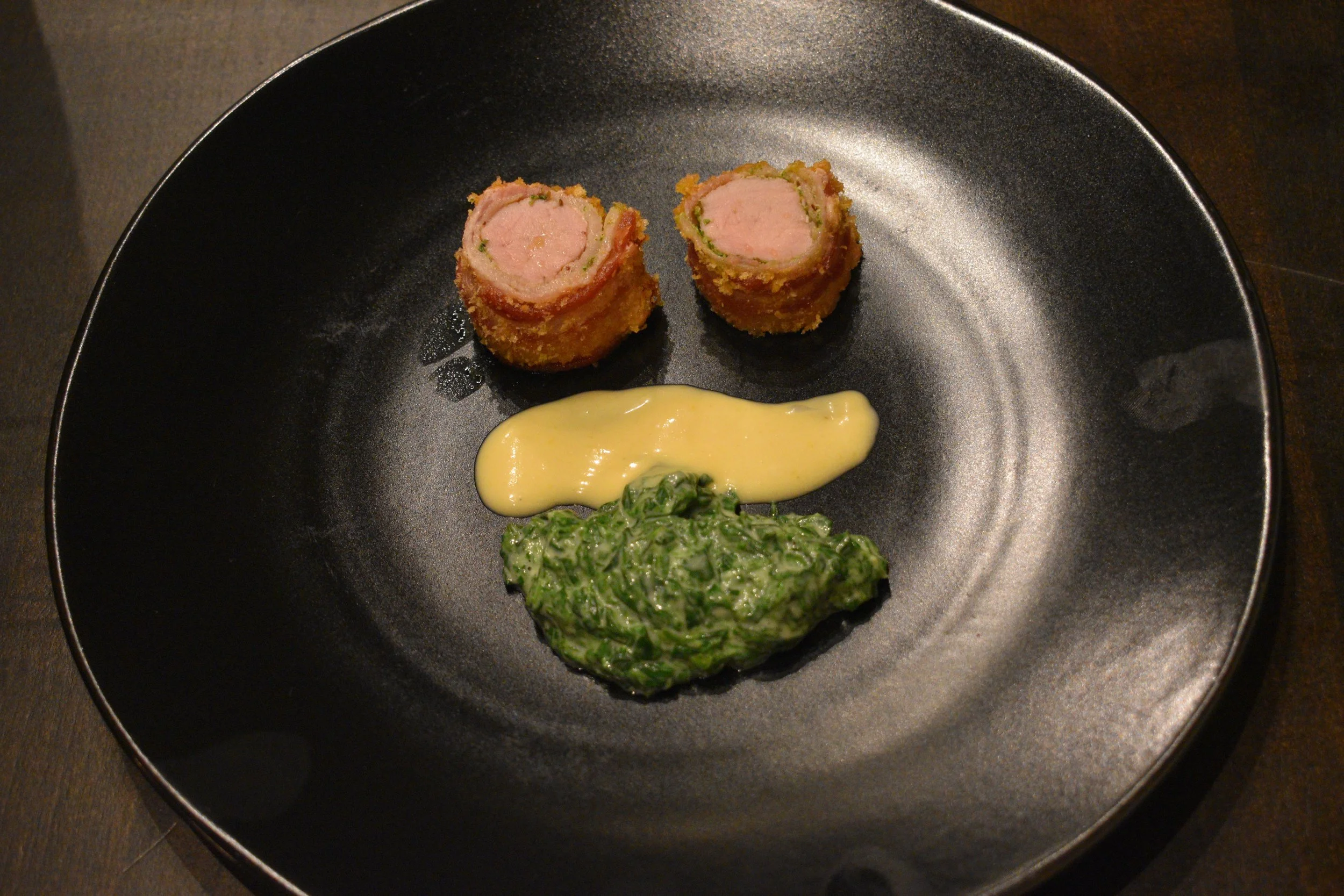 3rd Course: Chinese Five Spice “Porchetta” with Creamed Spinach and Chinese Mustard Sauce. Pork tenderloin, coated with a porchetta pesto and Chinese five spice and then rolled in bacon. It is then roasted and finally rolled in crumbled pork crackling.