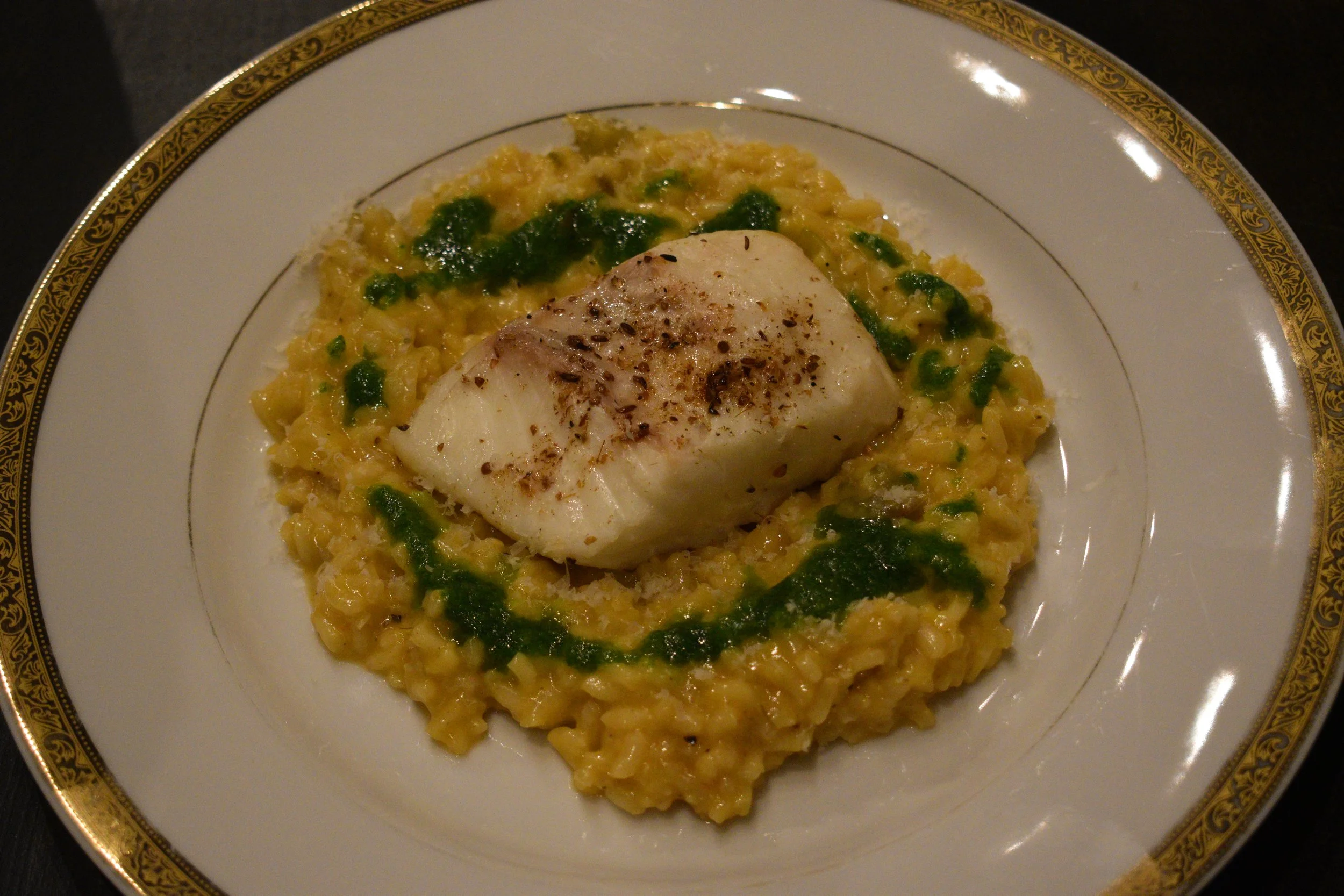 2nd Course: Roasted Halibut topped with lardo, risotto Milanese, Chinese Mustard green sauce.